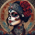 A woman adorned in vibrant traditional attire with intricate makeup depicting a sugar skull, complemented by flowers in her hair and ornate jewelry, set against a dynamic, fiery backdrop.