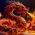 A majestic red dragon coils gracefully in a lavish gilded hall, surrounded by shimmering flames and ornate golden details, radiating power and mystique in a captivating fantasy setting.
