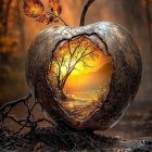 A heart-shaped apple reveals a serene landscape with a sunset over mountains and a lake. Around it, autumn leaves and rocks reflect the warm colors of the season in a tranquil setting.