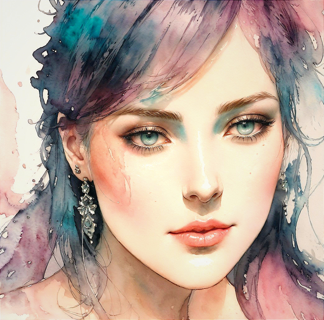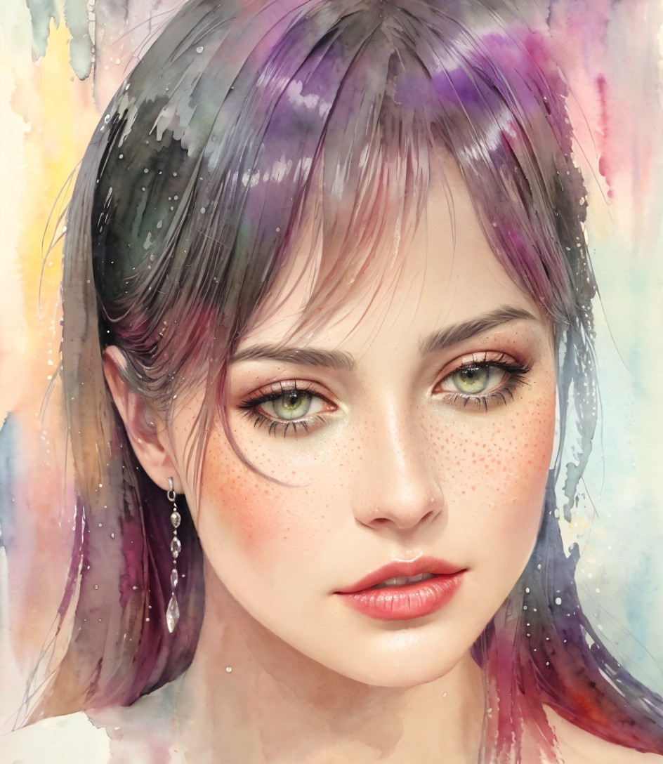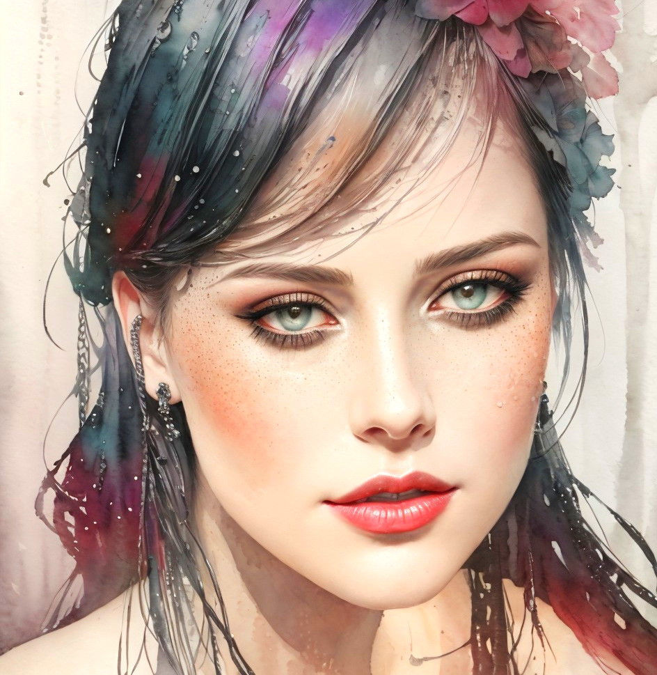 A digital painting of a woman with multi-colored hair, green eyes, and watercolor effects.