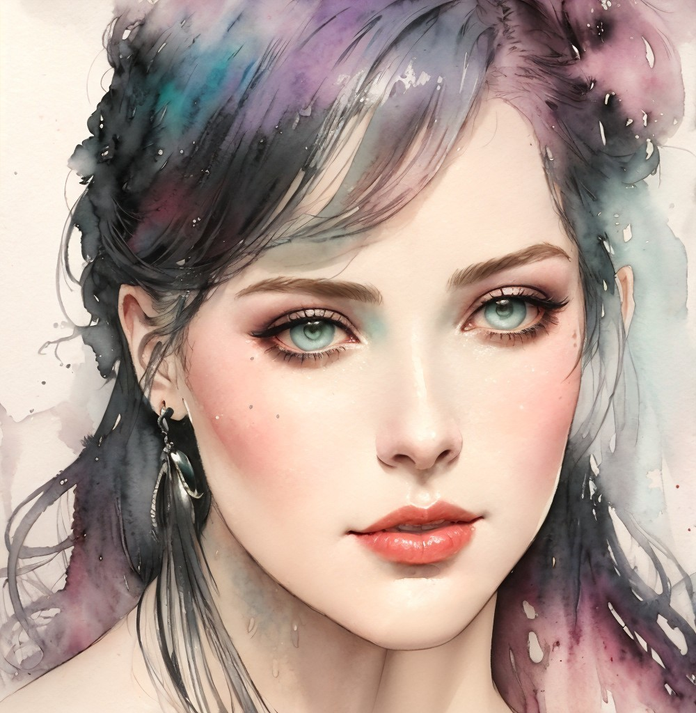+ Prompt:Portraiture using wet ink, Temptress portrayed in watercolor and ink, ink blots and charcoal, swamp background, collage, mixed media, female head pointillism, embossed details, fantasy patchwork, hues, mist and grain, particles, dreamy, soft round edges, serene, brightness 1.4, silver particles, gazing upwards with a sense of rage and frenzy, Detailed corrosion, rust, background with a back-lit river with swamps and trees, grain, patina. Dark composure in filigree lines, dark fantasy art, eerie, somber, brightness 1.8, high coloring, triadic color schemeof auburn and grey and brown. 3d effects 1.8 in style of Overton Loyd, highly detailed hairdo features, gothical, grain, blurry aura, highlighted reflections, psychedelic psychpomp scene, decease and decay, quilling, rusticcore, detailed hairdo, 1980s fantasy movie still, synthetic essence, 3d effects 1.8, shadow mapping 1.3, dynamic lighting, anisotropic filtering 1.7, raytraced shadows 1.8, subtle, anglo gothic 1.9, daguerreotype photography on old paper, saturated colors 1.5, perfect handsface, cel-shaded, golden ratio, colorful iridescence 0.7, retrofuturistic details, spiritual essence, encaustic strokes, gorgeous composition 1.9, fine strokes, plasticity in style of Overton Loyd, beautiful composition 1.9, vector 9:5, stacked-up perspective, rim lighting 1.7, Pastel colors, muted colors, limited palette, pallor, grease, comical sketch art by William timlin, plushy psychpomp scene 1.7, gouache