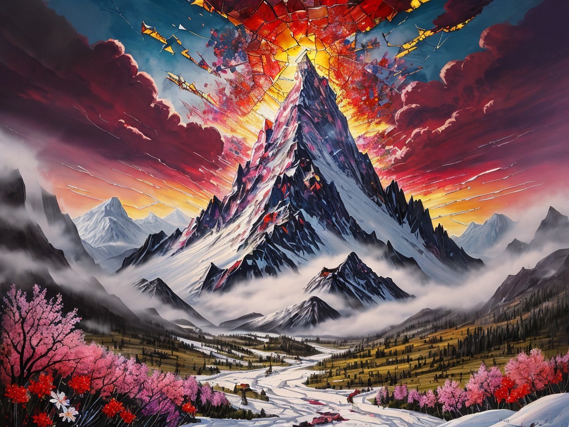 A vibrant painting features a majestic mountain range, dusted with snow and blooming flowers. At the center, an antique glass tower with a fire glows amidst dark clouds and a crimson sky, with sunlight breaking through. Shattered glass effects frame the scene, enhancing its dramatic beauty.