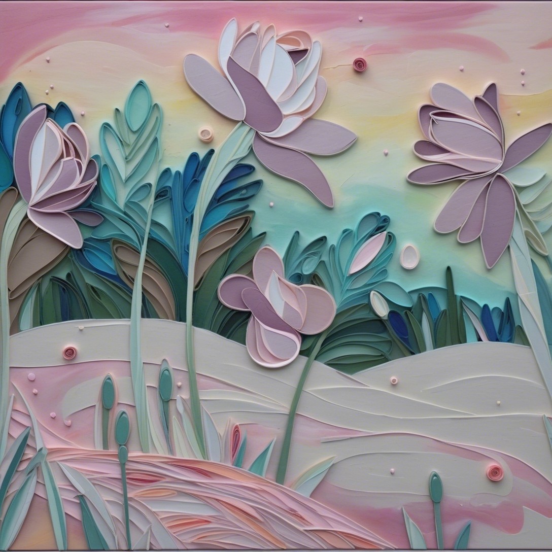 This art piece features beautifully crafted layered flowers and leaves in soft pastel colors, set against a dreamy background of gentle gradients, evoking a serene, tranquil landscape.