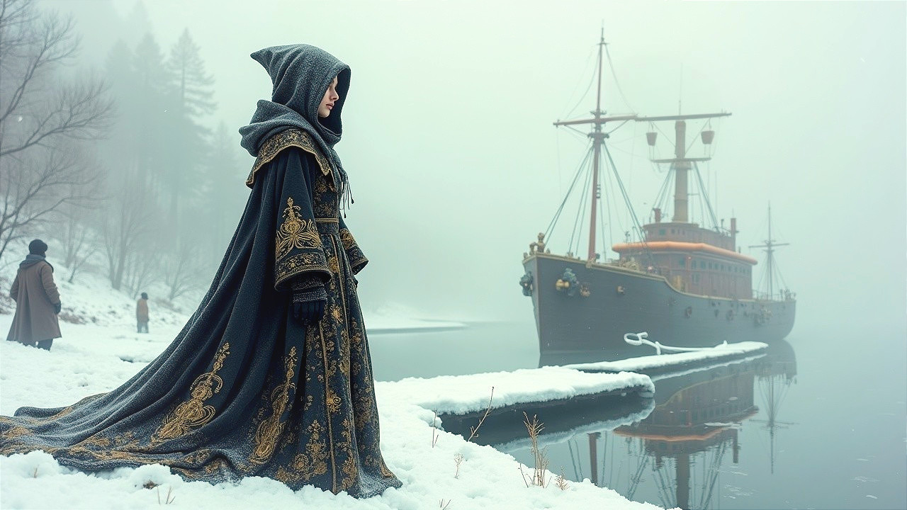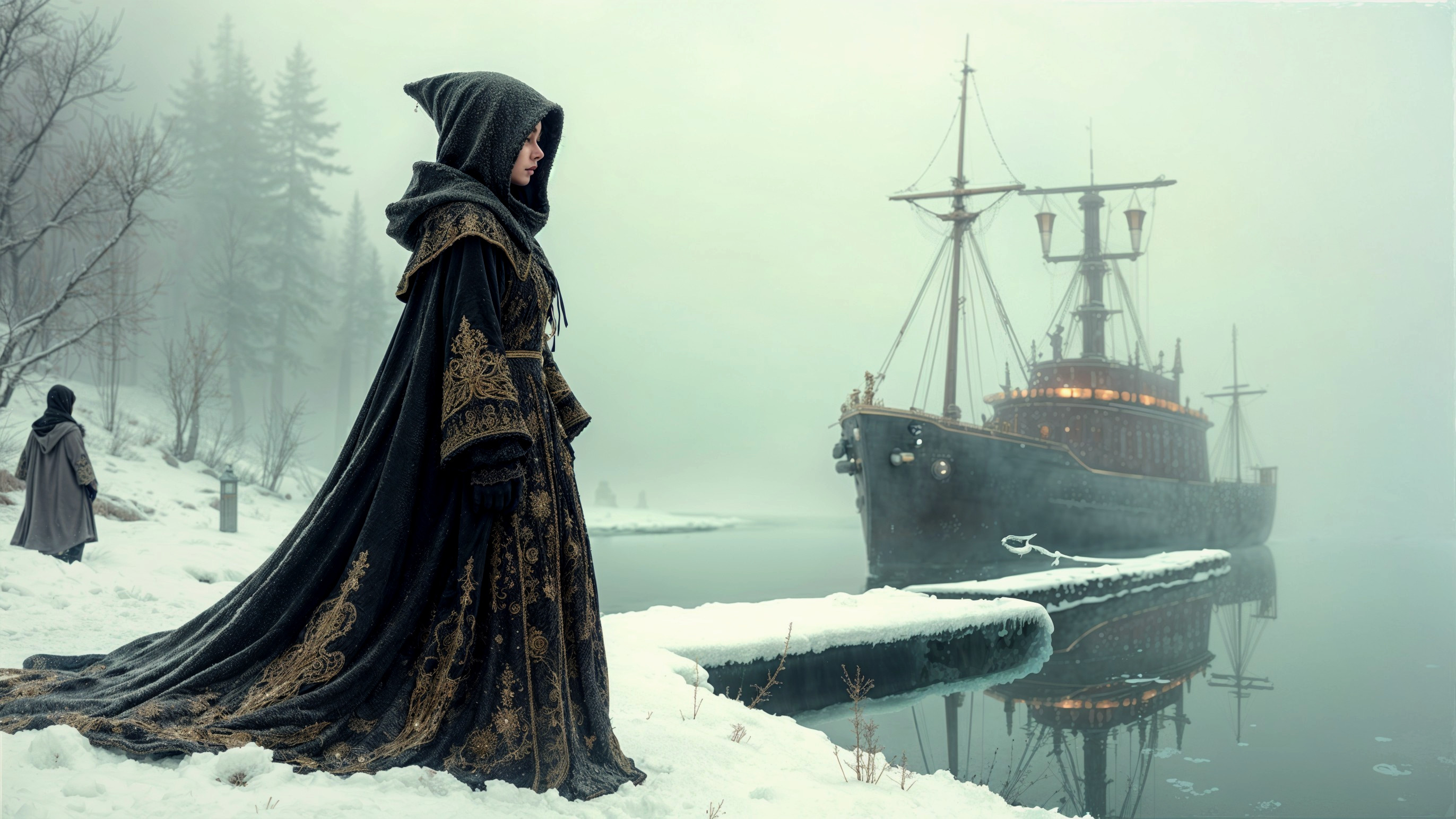 Prompt: "Mysterious hooded girl in lavish, intricately embroidered black and gold robes with metallic accents and subtle gearwork details, stands at the edge of a mist-shrouded frozen lake, blending seamlessly into the eerie dystopian winter landscape, as a steampunk marine ship, with copper pipes and brass fixtures, lies frozen in the ice, while peasants in the distance gaze up at a majestic airship soaring above the dreamy winter scene, with abstract, swirling wallpaper-like patterns of frost and snow, a jetty emerges from the snow-covered bank, and a lone hooded figure blends into the mist, as the icy lake merges with the fog, in a palette of soft, muted whites, blues, and grays, evoking an otherworldly quality, with blurry edges and a serene atmosphere of tranquility, reminiscent of the works of Simon Stalenhag, Ash Thorp, and Loish, in a highly detailed, 8k resolution conceptual illustration, trending on Artstation."