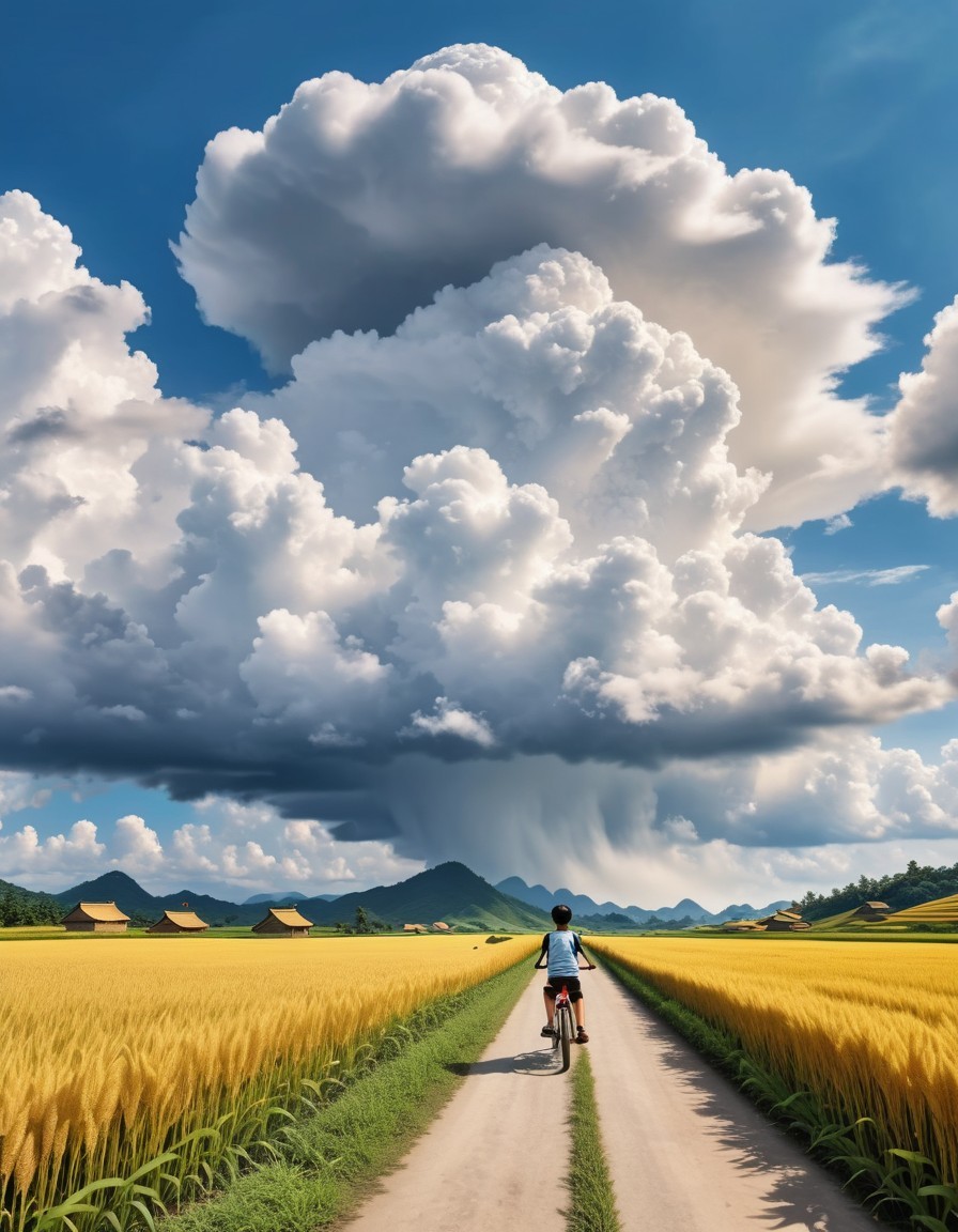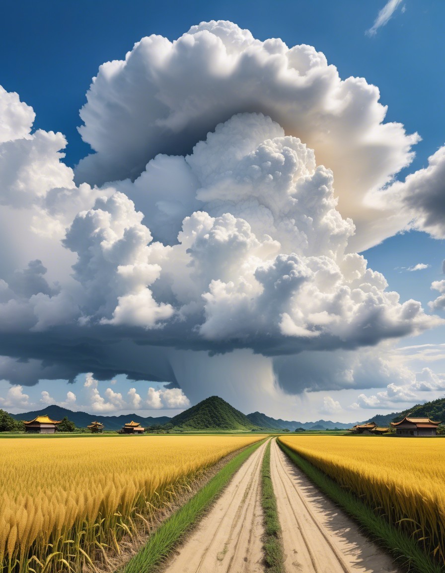 A dramatic scene features a towering cloud formation resembling an explosion over a lush, golden rice field, with a dirt path leading towards the distant mountains under a blue sky.