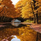 Nestled among vibrant autumn trees, rustic wooden houses line a tranquil pond. The warm hues of orange and gold reflect on the water, creating a serene, picturesque scene.