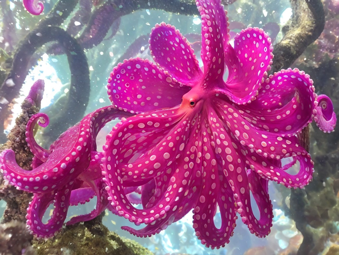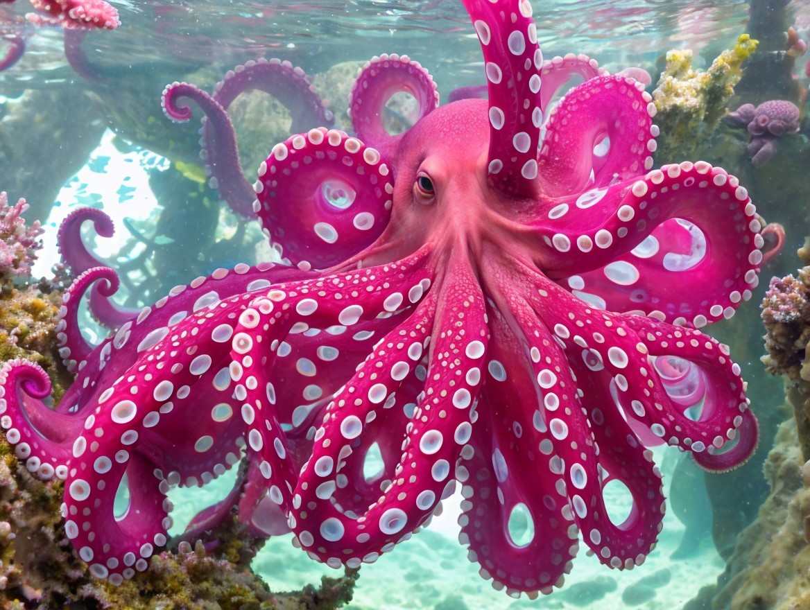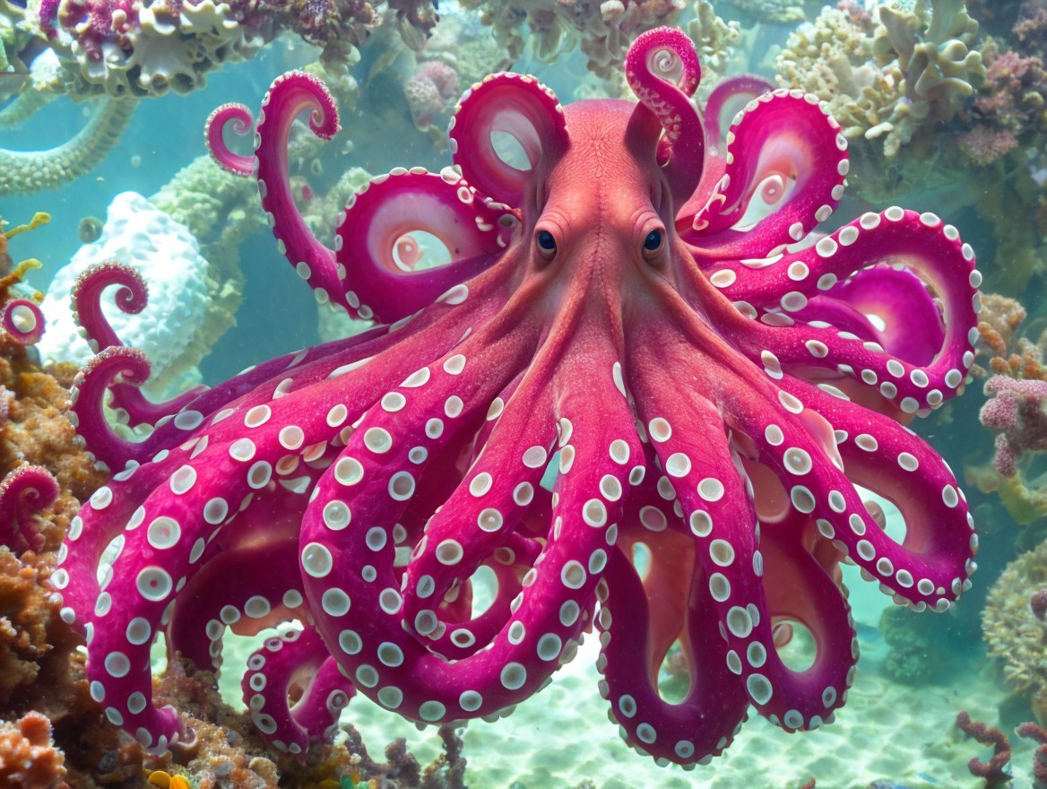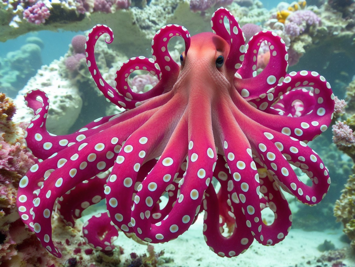 Vibrant Pink Octopus Amidst Colorful Coral Reefs
