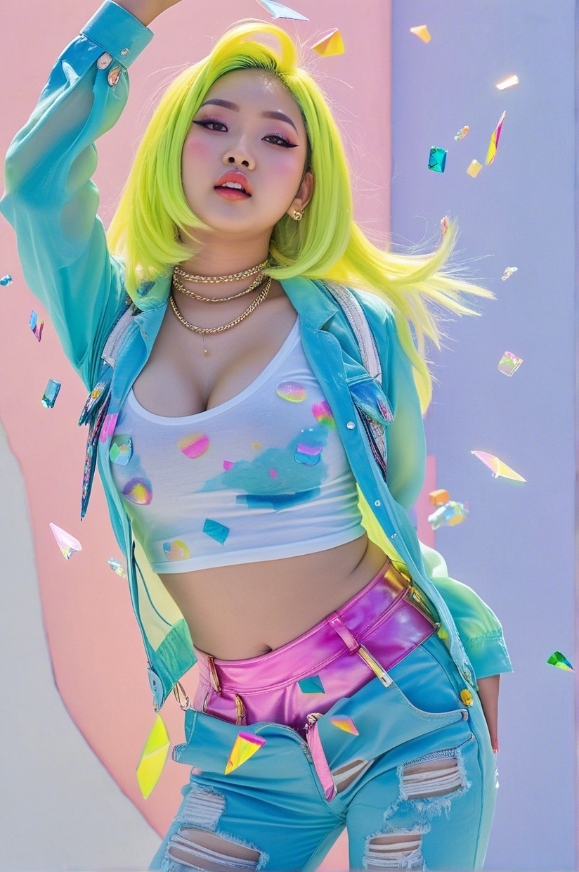 cute curvy Cambodian girl, wears Japanese Harajuku fashion subculture outfit, neon yellow hair, big chest, floats in mid-air, body a bit transparent, caught in an out-of-body experience. world fractures, shards of broken glass, each reflecting different hallucinatory scene, psychedelic pulse, kaleidoscopic patterns that ripple like liquid rainbows. Vivid colors explode in chaotic harmony: electric purples bleed into neon greens, while deep cosmic blues swirl like ink in water. dripping ink, fishnet stockings, she is calm yet distant, eyes and mouth open as if surrendering to a vivid psychosis dream, reality unraveling into abstract dimensions, heat waves on acid. hyperrealistic textures and painting with dynamic lighting and an otherworldly atmosphere, reminiscent of Frank Frazetta