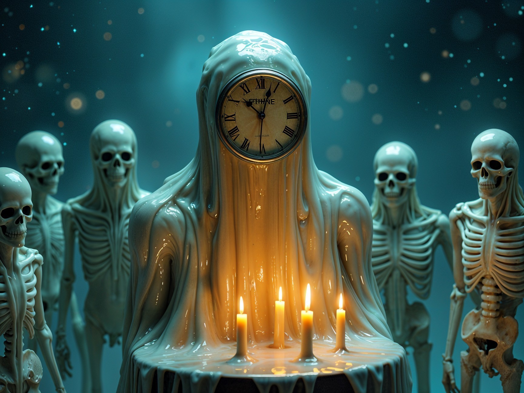 A serene, ethereal statue of a hooded figure holds a glowing orb, surrounded by other statues in a mystical, dimly lit space featuring ornate details, like a clock and intricate backgrounds.