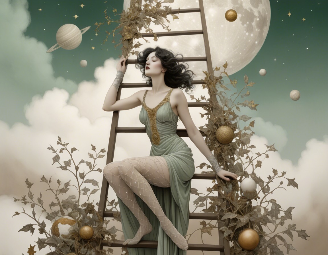 A vintage-inspired illustration of a woman on a ladder among clouds, stars, and celestial bodies, evoking a dreamy, fantastical atmosphere.