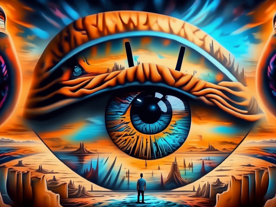 A surreal landscape features a giant, vibrant sun with expressive eyes overlooking a lone figure standing on a barren ground, surrounded by vivid colors and abstract formations.