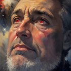 A thoughtful portrait of a man gazing upward, surrounded by a cosmic backdrop. His expression reflects wonder and contemplation, with vibrant colors enhancing the celestial theme.