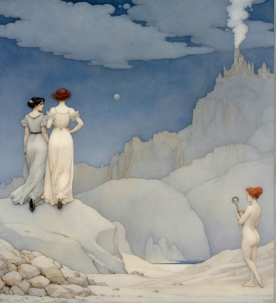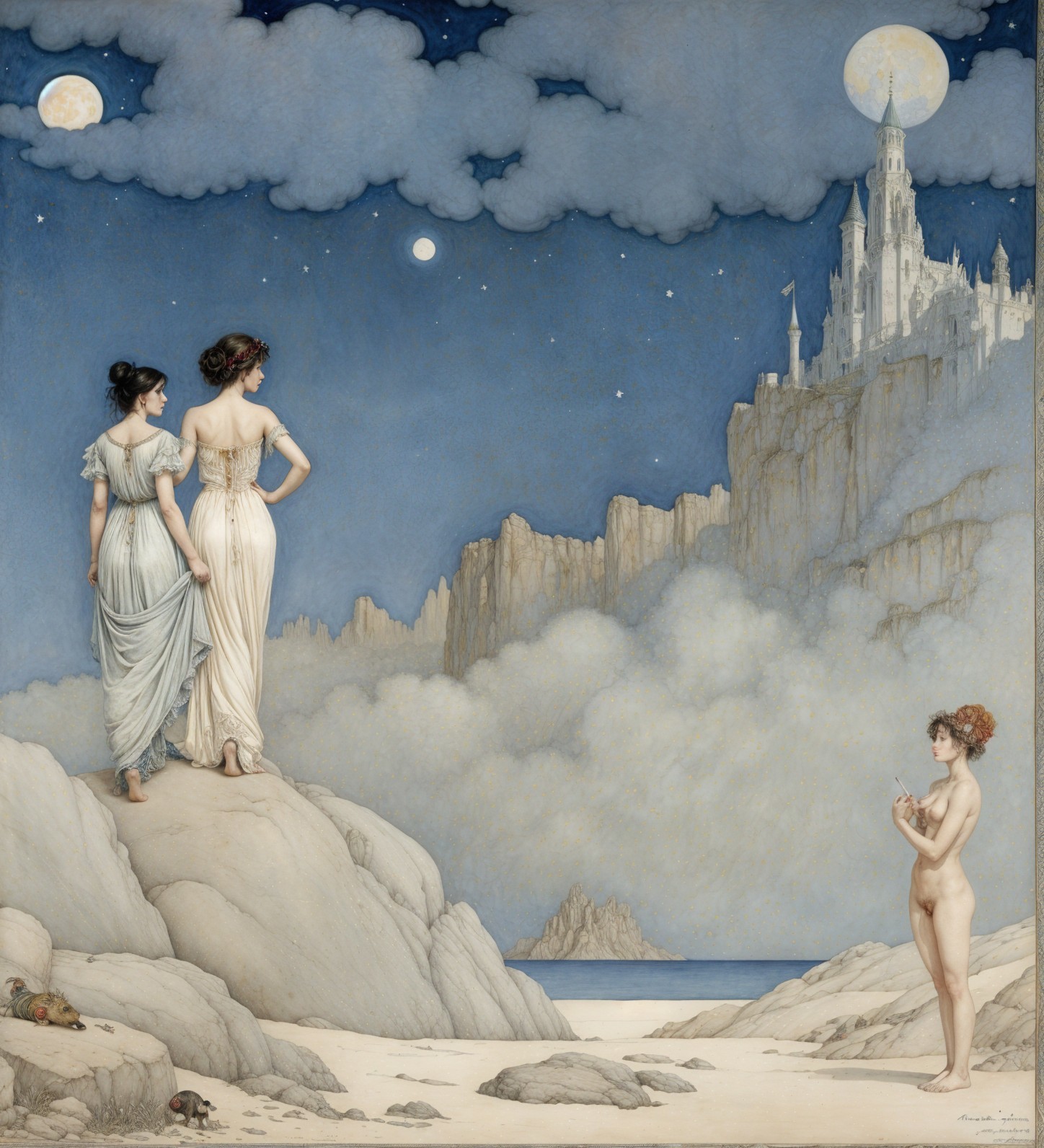 Legend of the Girl and the Singing Nightingale, Medieval Japanese Artists Sumi-e Style, Velvet Black, Shabby, Dull Gold, Amber Gray, Golden Ratio, Surreal Fantasy, Elegant, High Definition Ultra Fine 3D Line, Zenangle Style, Watercolor Patchwork , Arthur Rackham Style, Paul Kidby, Gediminas Prankevicius, Jacek Jerka, Extremely Detailed, Intricate, Thoughtful, HDR, Fractal, Beautiful, Award Winning, Fantasy Look, Fantasy, Crisp Quality