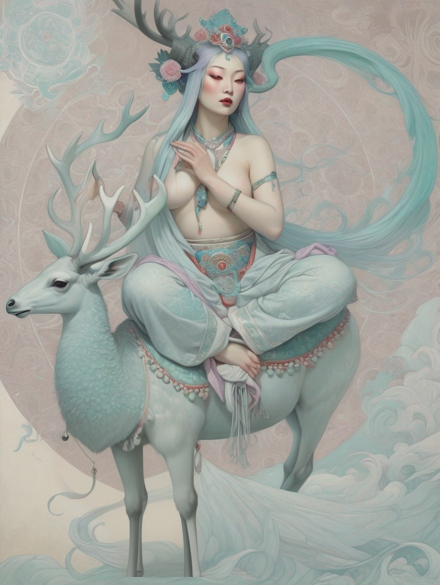 Tibetan thangka art of a Full-length stunning half body Portrait Of a Manjushri riding on top of one chinese mythical red deer with antlers in the style of JB Waterhouse, Carne Griffiths, Minjae Lee, and Ana Paula Hoppe featuring a dragon silhouette intertwined with whimsical swirling blue & white clouds.