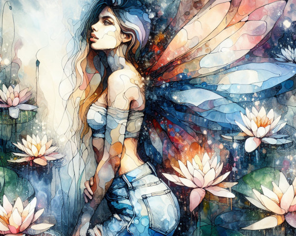 This vibrant artwork features a profile of a woman with flowing hair, adorned with gold patterns. The background is a cosmic blend of deep purple and teal, creating a mystical atmosphere.