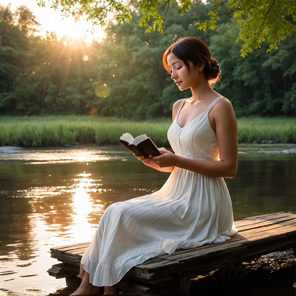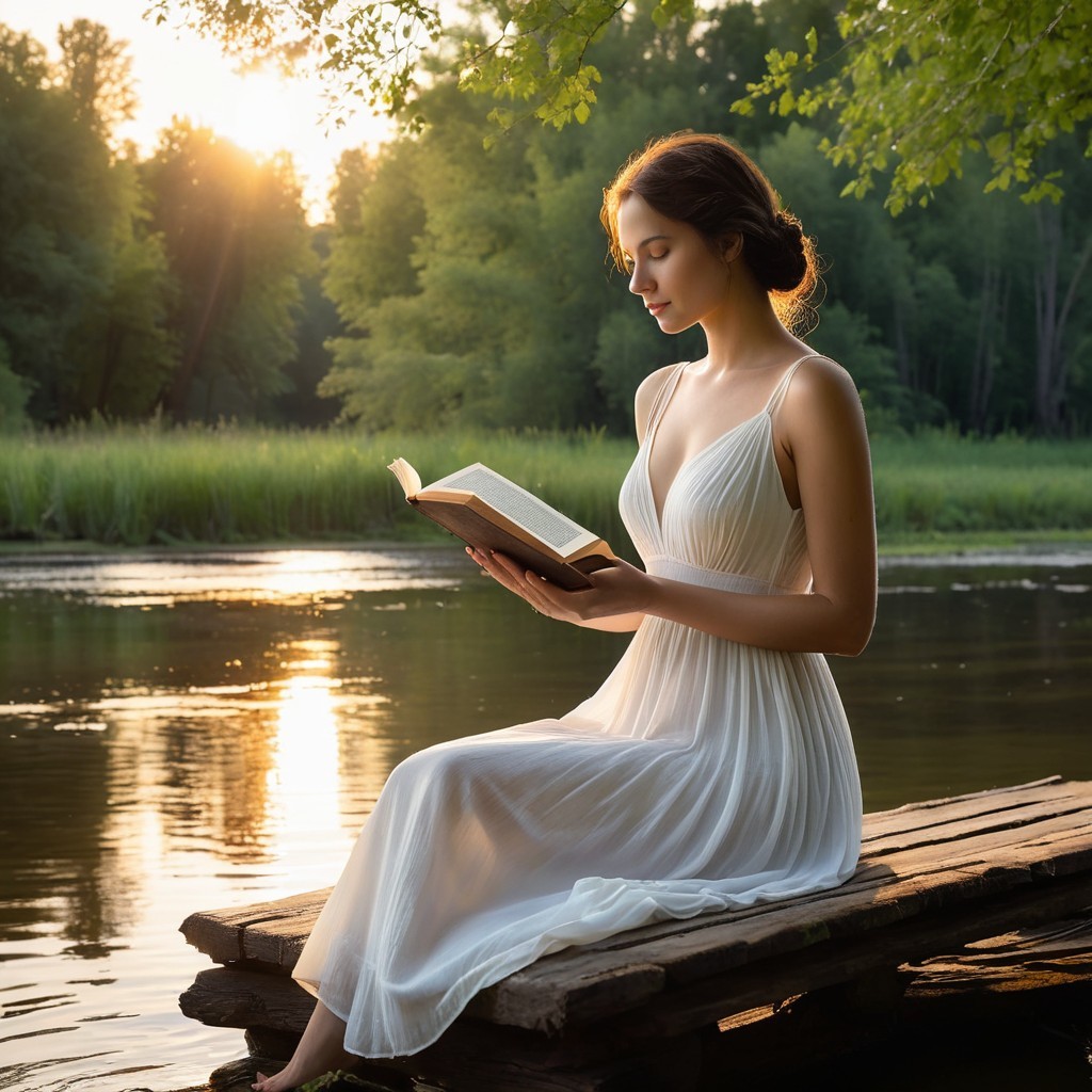 (Try from Qqpin) - A young woman in a flowing dress sits on a wooden dock, engrossed in a book. The serene landscape features lush greenery and a shimmering lake, illuminated by the warm glow of sunset.