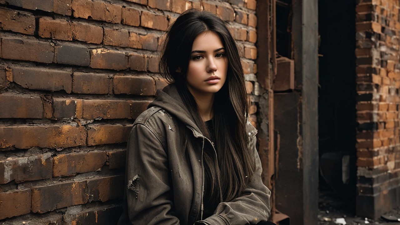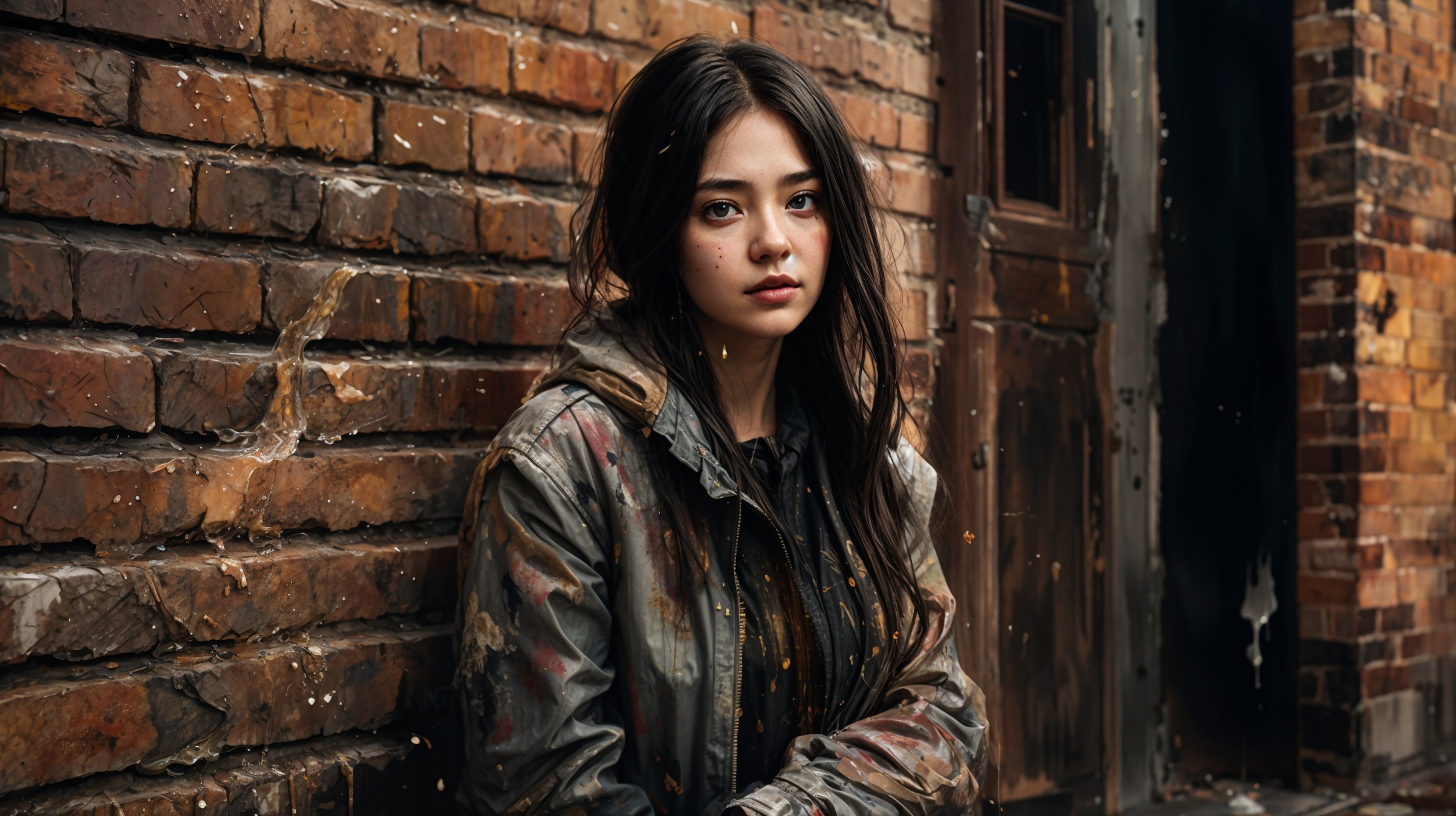 A young woman with long, dark hair sits against a weathered brick wall. Her expression is contemplative, and her jacket is splattered with paint, suggesting an artistic environment.