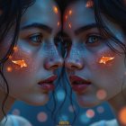 A close-up of a man and woman gazing intensely at each other. Their faces are adorned with shimmering patterns, and tiny goldfish swim around them, creating a dreamy, surreal atmosphere.