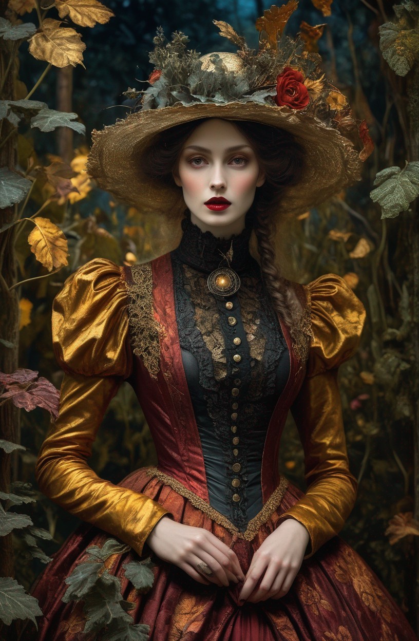 Striking Red-Haired Woman in Victorian Gothic Outfit with Autumn Leaves Background