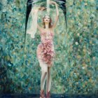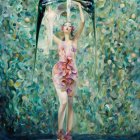 A graceful figure emerges from a vibrant, swirling background, adorned with delicate flowers. Water cascades elegantly, adding a serene, dreamlike quality to the enchanting scene.