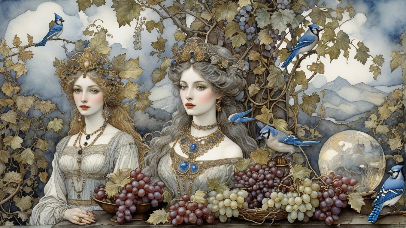 Two elegant women adorned with grape adornments and intricate jewelry are surrounded by lush vines and blue jays. The backdrop features rolling hills under a serene moonlit sky.