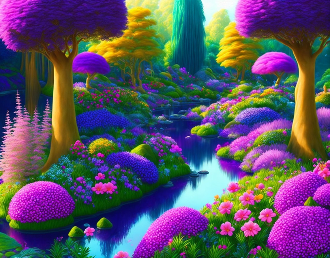 Create a vibrant and colorful fantasy landscape with a serene and magical atmosphere. Feature an enchanting river gently meandering through richly hued flower beds and lush greenery. Include whimsical trees with slender trunks and vibrant purple, yellow, and pink canopies in a style reminiscent of soft, rounded, and fluffy shapes. Dominating the foreground, showcase a variety of flowers in pink, purple, blue, yellow, and orange, arrayed in rounded mounds and along the banks to add depth and texture. Reflect the bright and saturated colors on the water’s surface to create a sense of peacefulness. On the opposite bank, integrate a natural pathway made from smooth, flat stepping stones leading towards the background, lined by similar fantastical flora and fauna. Incorporate rich green foliage and topiary, some closely trimmed in spherical shapes, while others left wild to bring contrast and visual interest to the scene. The background should fade into a verdant, tree-lined horizon, with a hint of a cloudless blue sky peering through the canopy. Ensure the overall effect is one of a lush, otherworldly garden, teeming with vivid colors and a dreamlike quality.