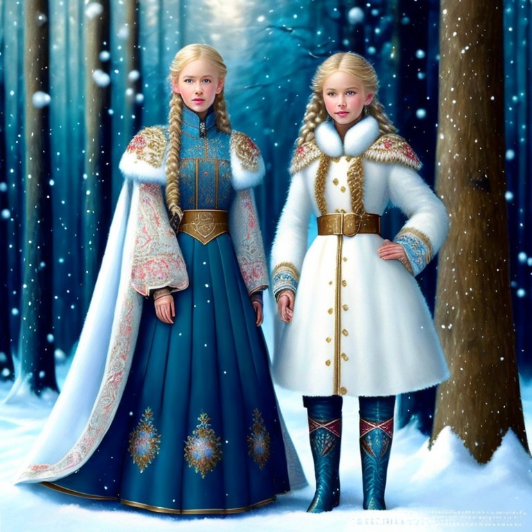 Prompt: "Winter landscape.A beautiful Russian girl with a blonde braid.The girl in the role of the snow maiden.A beautiful kokoshnik decorated with pearls.The girl is standing in boots.Beautiful boots.The boots are painted under the Gzhel.A blue dress. The dress is trimmed with white fur.Russian patterns. Gzhel.Richelieu lace.Oil painting."