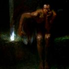 Franz von Stuck's 1890 painting Lucifer depicts the fallen angel as a muscular, nude figure seated in a dark space, propping his head on his left hand in a pose similar to Rodin's The Thinker. His right arm is drawn back to his body, cradling his dark, feathered wings, while his glowing, piercing yellow eyes stare directly at the viewer, conveying a mix of defiance, sorrow, and envy. The painting's dramatic use of light and shadow (chiaroscuro) highlights his form, and a phosphorescent crescent moon in the background adds an otherworldly glow, which may symbolize heaven