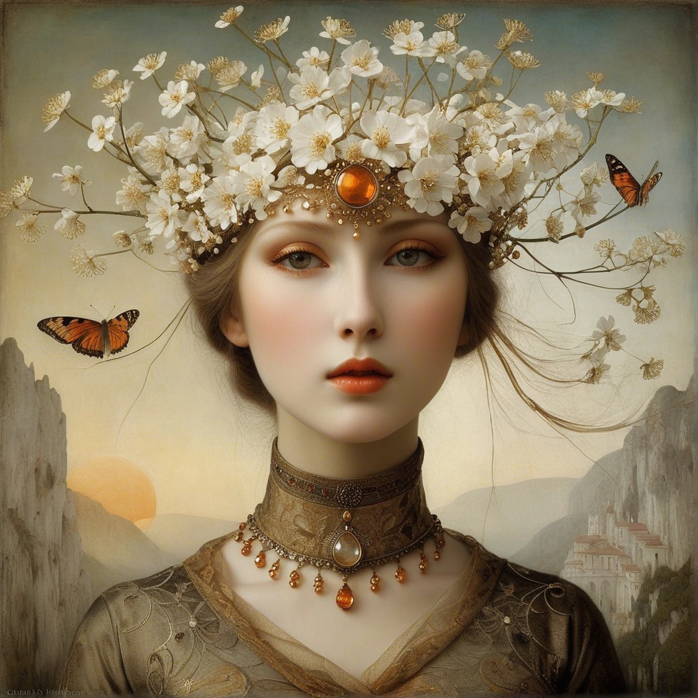 A serene woman adorned with a floral crown and elegant jewelry gazes into the distance, with a soft sunset backdrop and butterflies fluttering around, exuding a mystical, ethereal beauty.