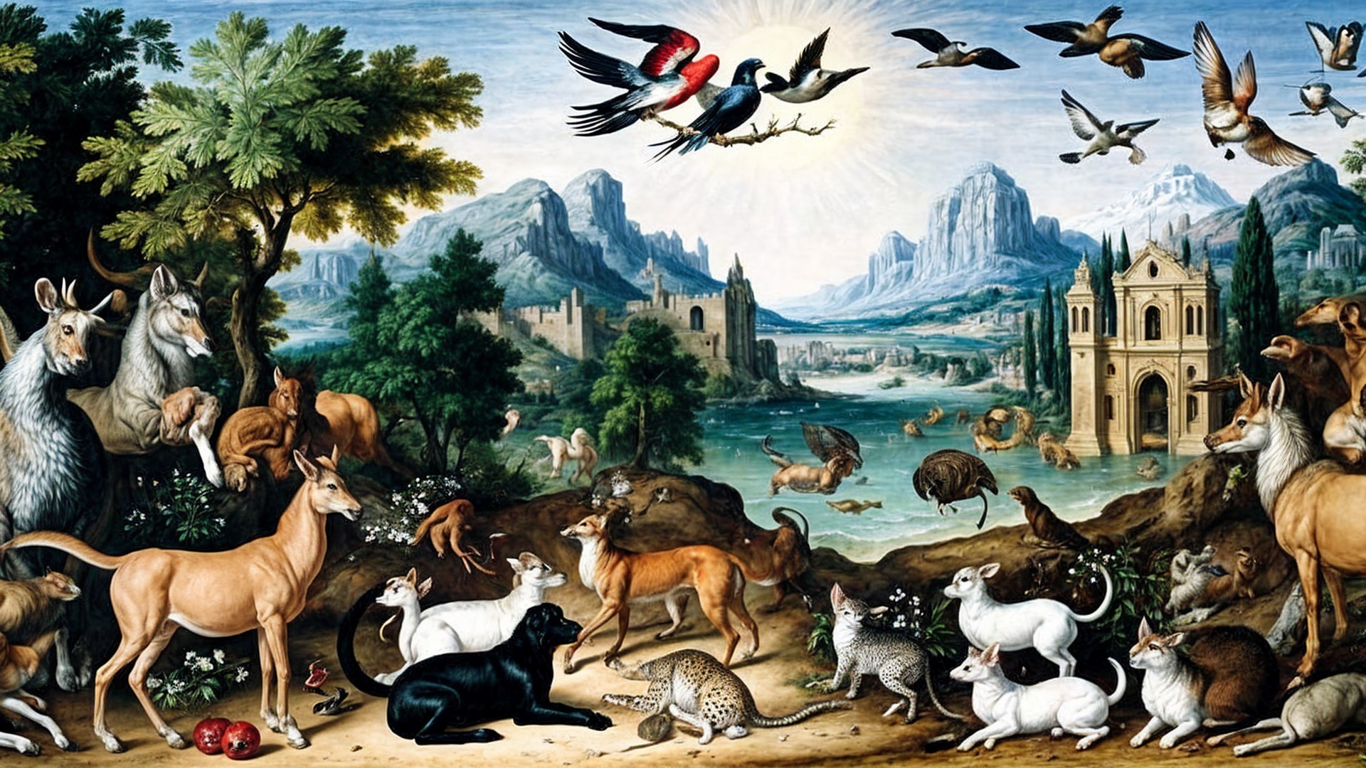 A serene landscape features a majestic castle by a tranquil lake, surrounded by lush mountains. Various animals, including deer, birds, and cats, coexist harmoniously among vibrant flowers.