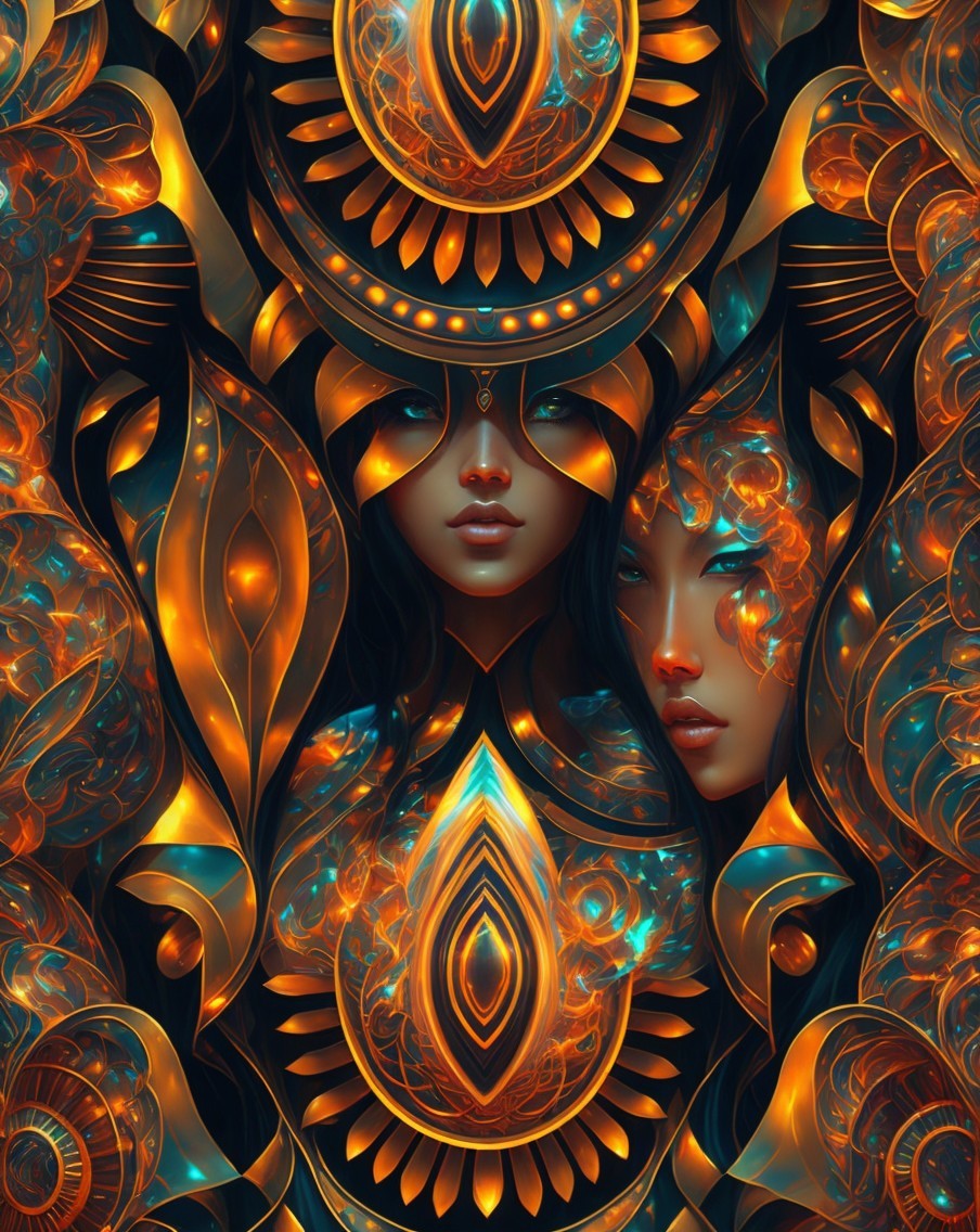 Ethereal woman in golden armor with glowing blue eyes among autumn foliage