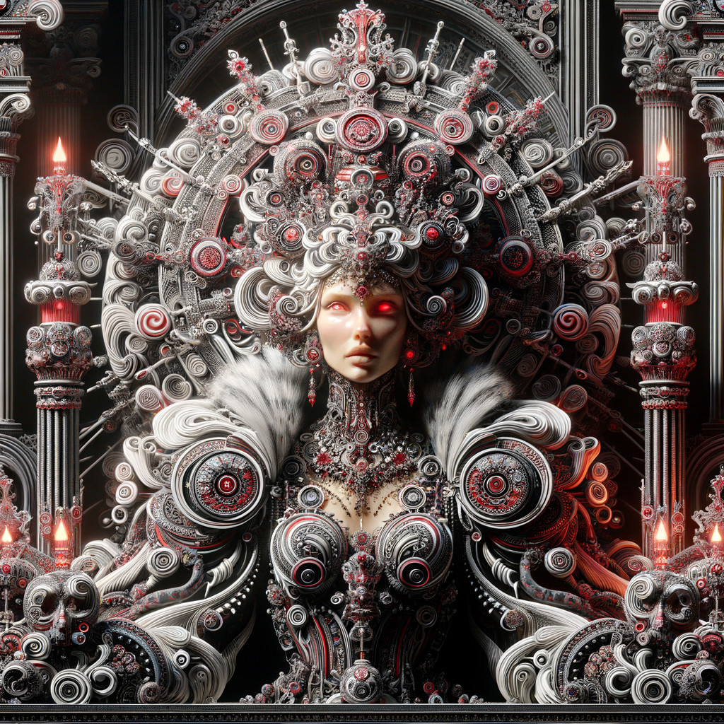 Prompt: "The most psychedelic scene imaginable, the most beautiful Scandinavian lady, intricate textures, black, white and red hues only, art by alex grey, 3d rendering, octane render