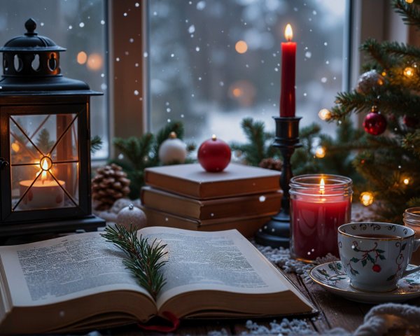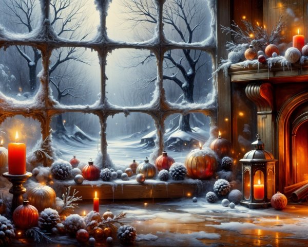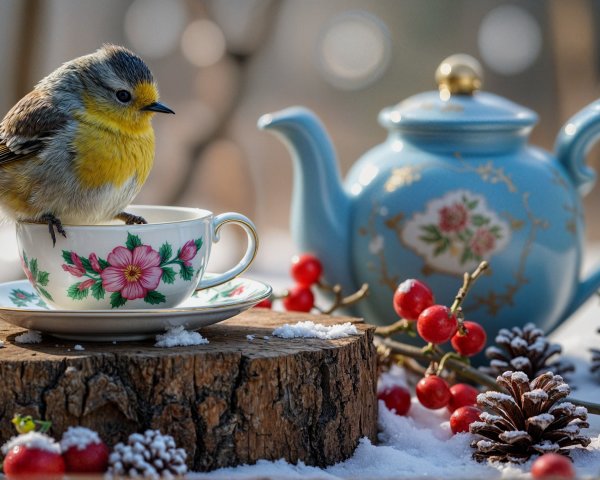 A cozy autumn scene featuring a colorful, patterned teapot and cup on a rustic wooden table. Vibrant fall leaves surround them, complementing the warm hues of the landscape.