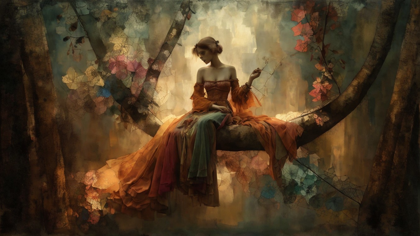 A woman in an elegant, flowing gown sits gracefully on a tree branch, surrounded by autumn leaves. She holds a small object, gazing thoughtfully into the distance amidst a dreamlike backdrop.