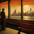 A man in a uniform stands by a large window, gazing at a stunning sunset over a city skyline, featuring tall buildings and a ship on the water, creating a serene, nostalgic atmosphere.