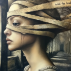The artwork features a woman's profile, her face seemingly fragmented by strips of texture, set against a backdrop of geometric walls and a mirror reflecting her image.