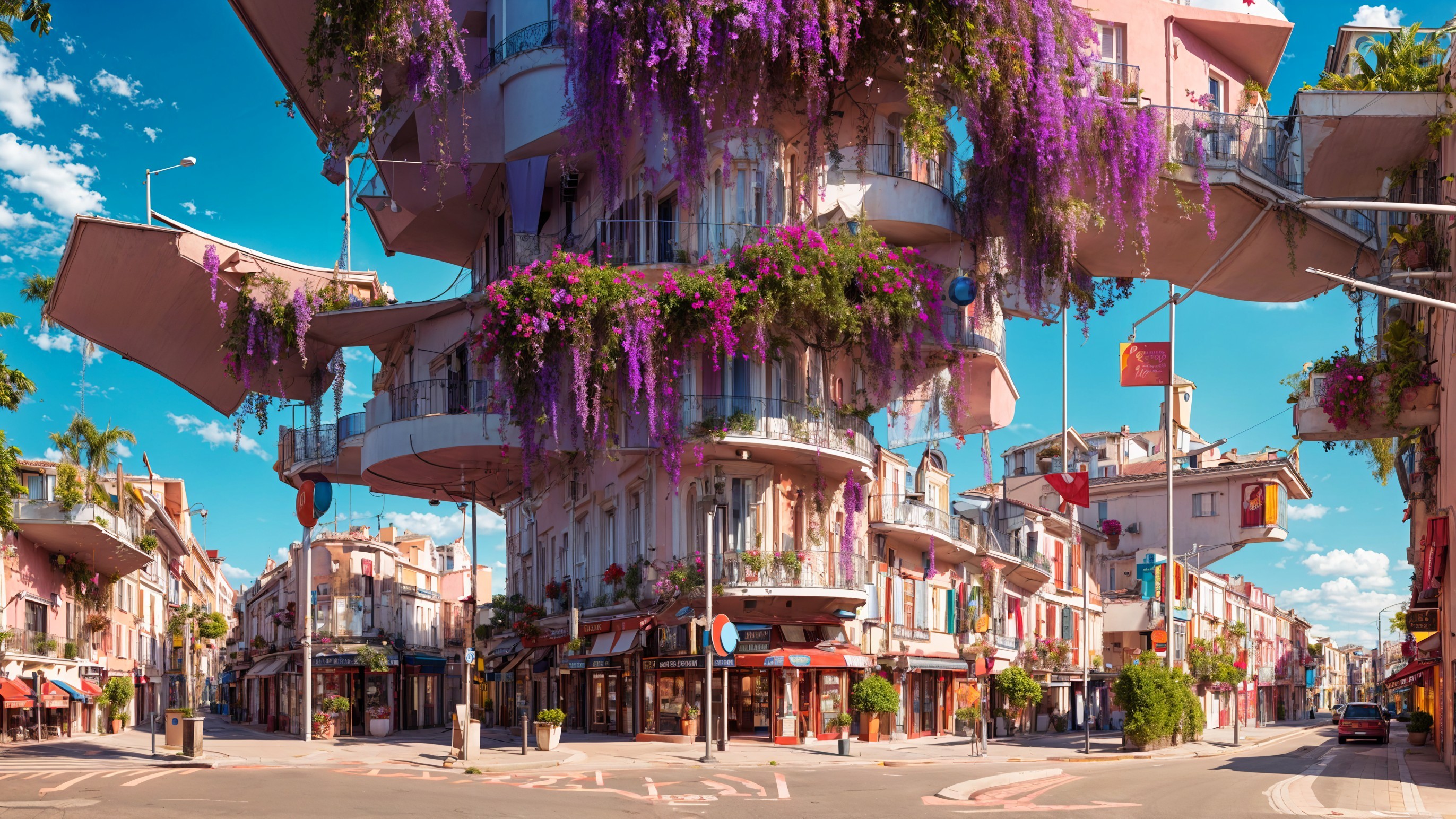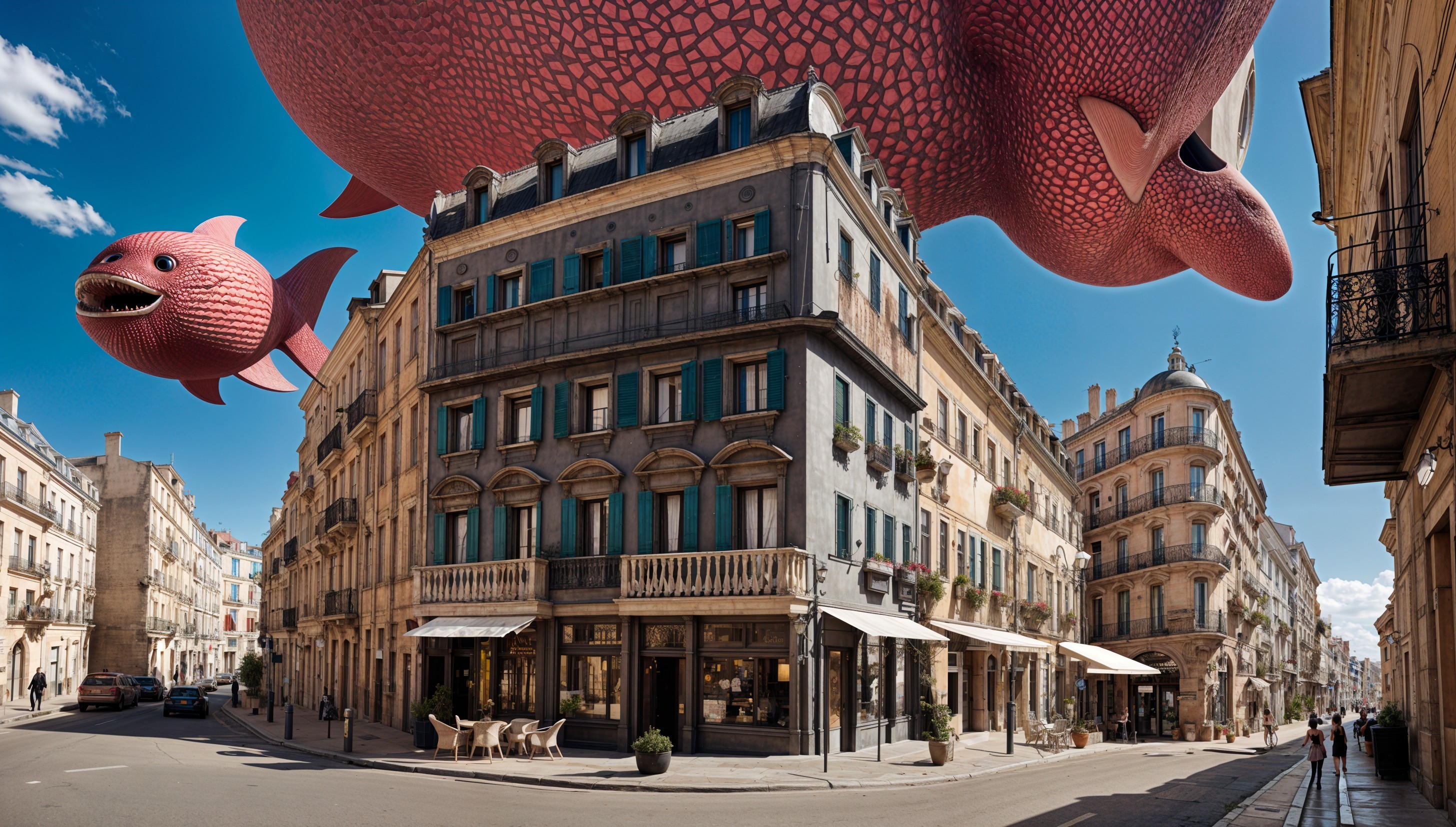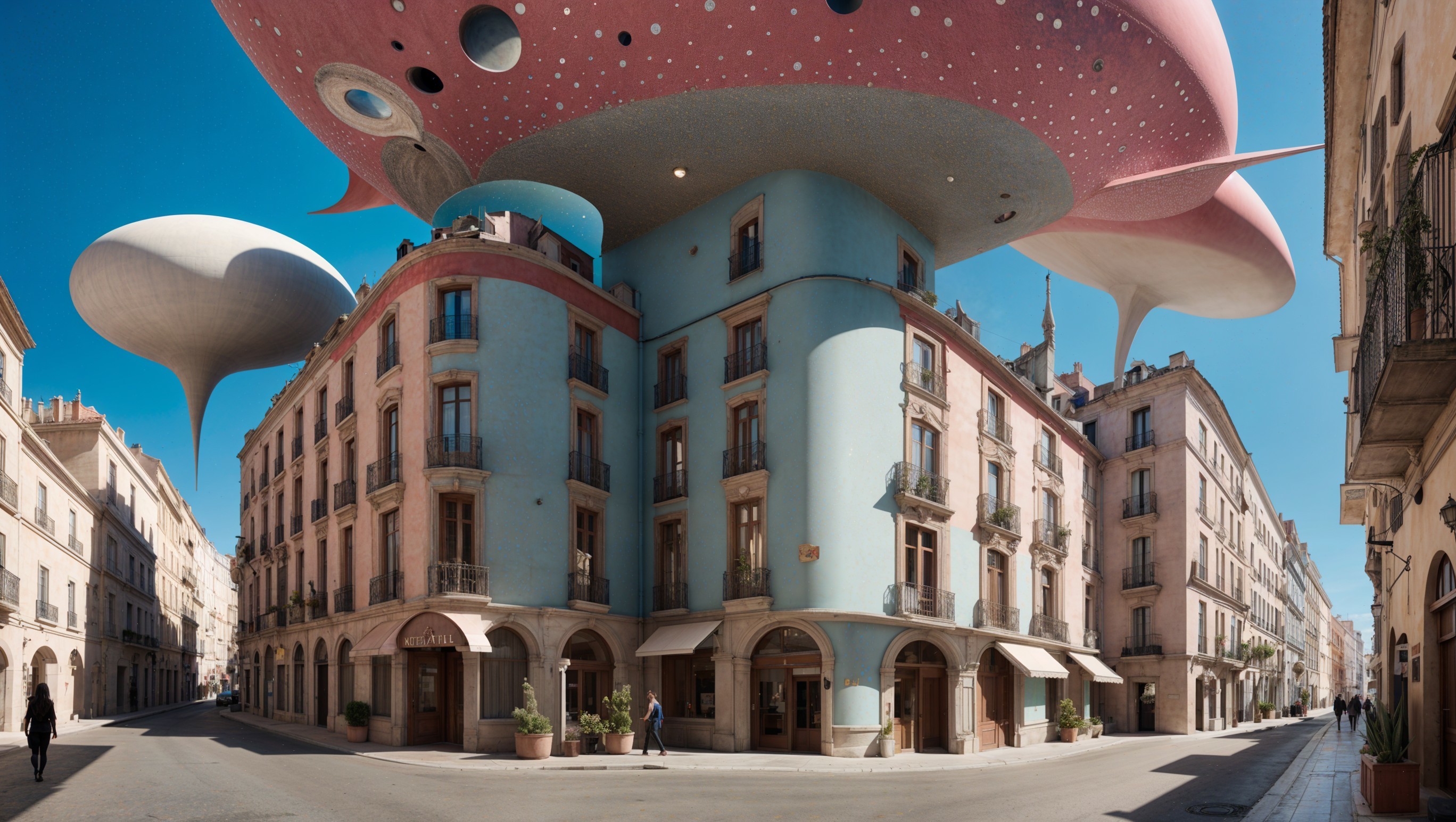 A unique urban scene features modern buildings beneath surreal, oversized floating structures against a clear blue sky. Pedestrians walk along the street, adding life to the imaginative environment.