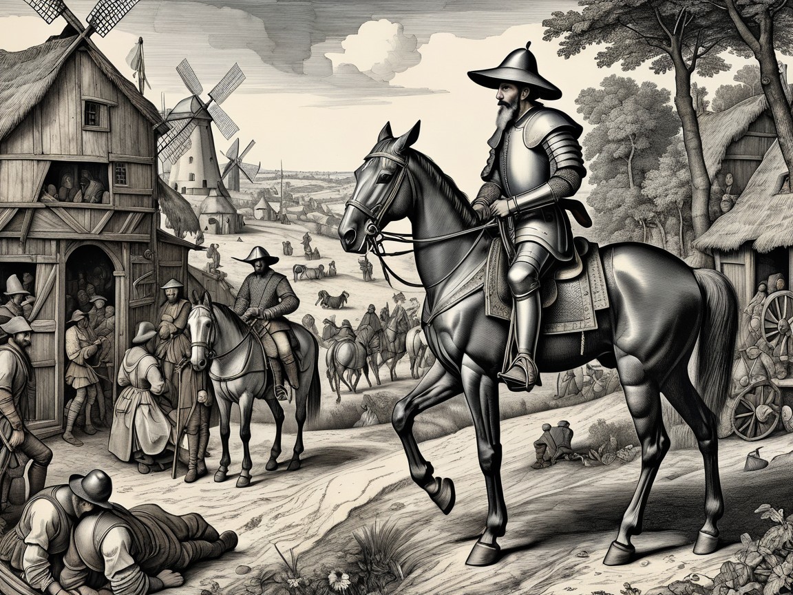 The scene portrays a medieval town with a horseman in armor, a bustling market, windmills in the background, and villagers going about their tasks, creating a lively historical atmosphere.