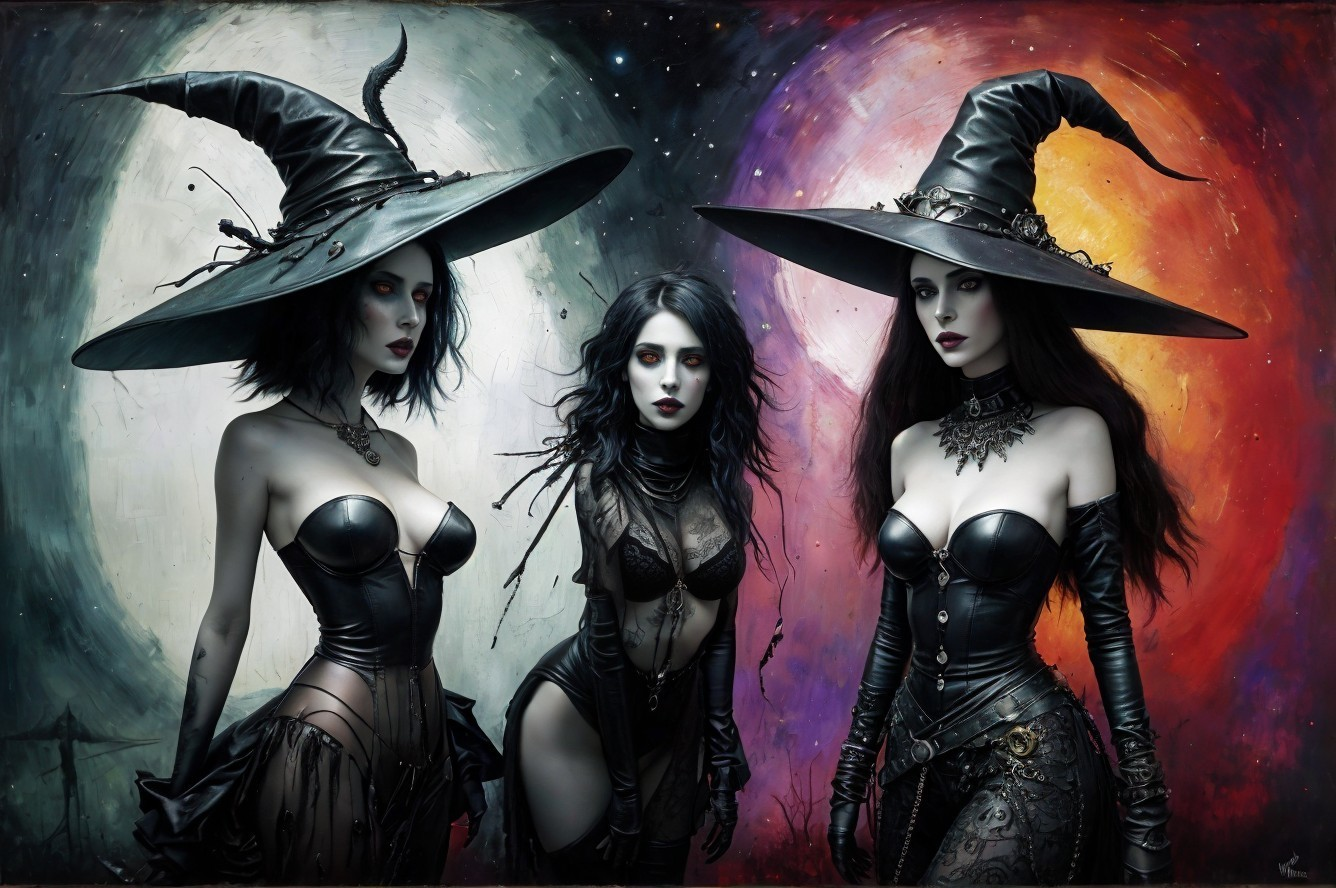 Three gothic witches in black attire and large hats stand in front of a swirling cosmic background.