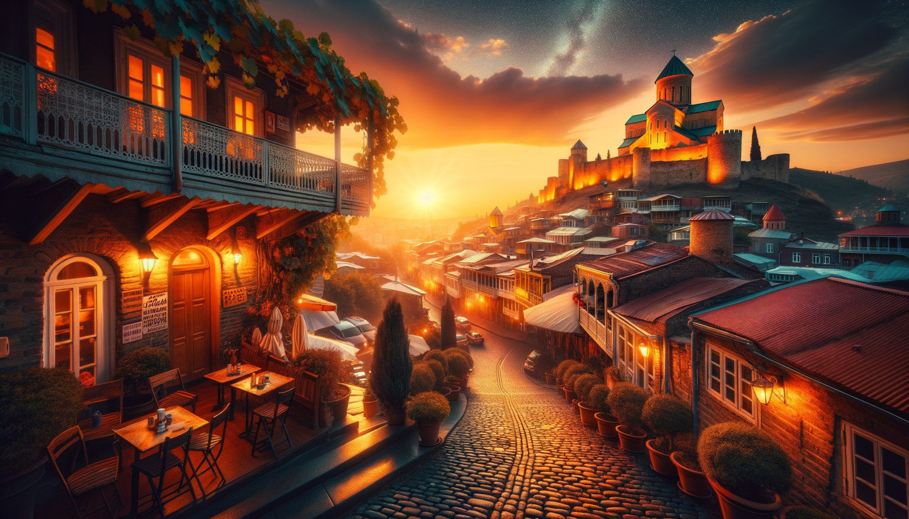 Mix of styles George Callaghan, Guido Borelli da Caluso, Debbie Criswell, Niko Pirosmani: Sunset Over Old Tbilisi: an image capturing the golden hour as the sun sets over old Tbilisi, casting a warm, amber glow on the cobblestone streets and the historic, vine-draped balconies of the Narikala neighborhood. In the foreground, a quaint café spills out onto the street, where locals enjoy traditional Georgian tea. The ancient Narikala fortress stands majestically in the background, overseeing the city. The sky transitions from a vibrant orange to a deep indigo, with the first stars beginning to twinkle above.