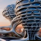The image showcases futuristic, organic architecture with intricate, porous designs. Towering structures feature smooth curves and vibrant colors against a clear blue sky.