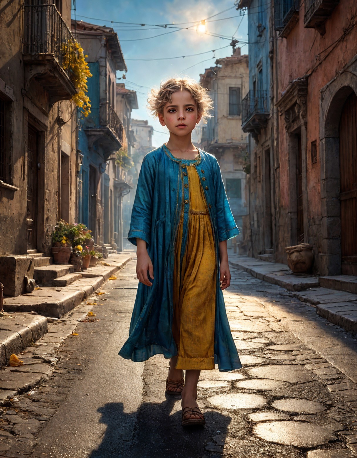 A young girl walks confidently down a narrow, sunlit street lined with colorful buildings. She wears a flowing blue coat over a yellow dress, embodying a sense of curiosity and adventure.