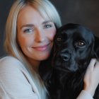 A close-up portrait photograph of a woman with long blond hair and striking green eyes, affectionately nuzzling a sleek black dog. She is wearing a simple cream-colored sweater and a gentle smile plays on her lips as she embraces the dog. The black dog, with soulful eyes and a shiny coat, rests its head comfortably against the woman’s cheek. Soft, natural light illuminates the scene, creating a warm and intimate atmosphere and highlighting the loving bond between them.