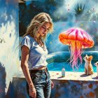 A young woman stands by a pool, gazing thoughtfully. Beside her, two playful puppies watch a vibrant jellyfish floating above. Colorful petals scatter through the air, enhancing the whimsical scene.