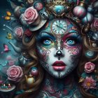 A vibrant fantasy portrait featuring a woman with striking blue and pink makeup, adorned with jewels and colorful flowers. Her face is decorated with intricate designs, exuding a whimsical charm.