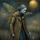 A woman in a vintage coat stands amidst a twilight scene filled with tents and floating lanterns. She has large, delicate butterfly wings that shimmer against a glowing moon.