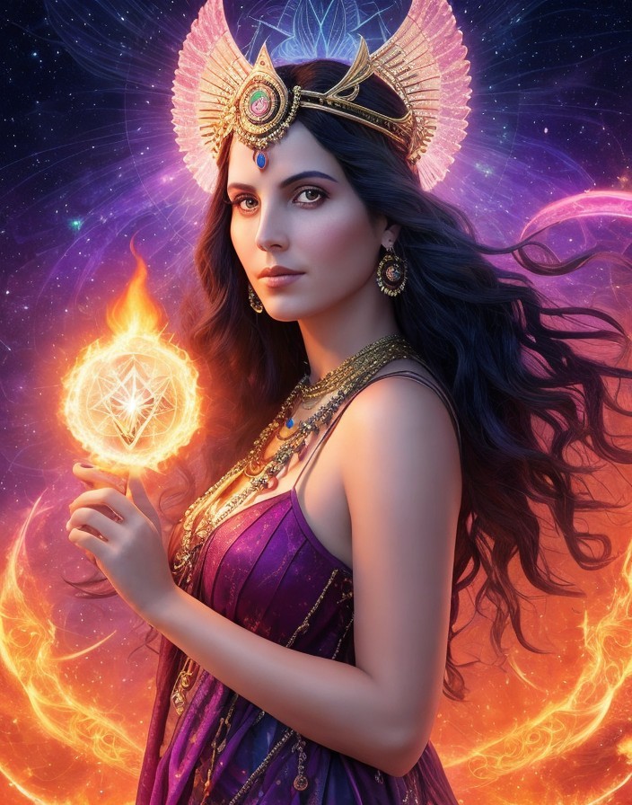 Prompt: "Promethea embodies the essence of divine feminine power through her association with magic, art, fire, and language. As a psychopomp, she navigates the borders between worlds, offering inspiration and igniting the imagination of those who seek her guidance. Her presence transcends mortal limitations, symbolizing the boundless potential for creativity and transformation that exists within each individual."