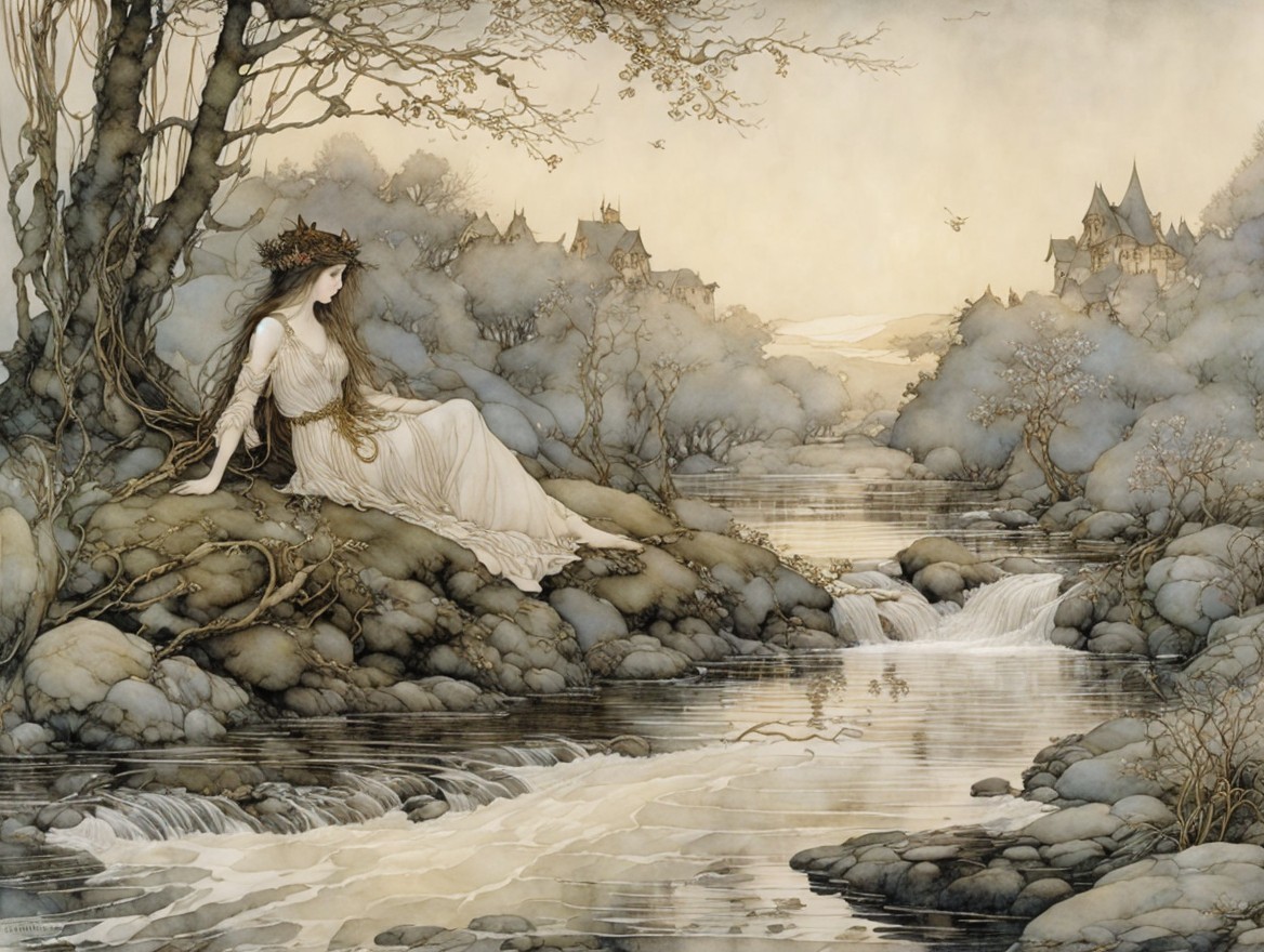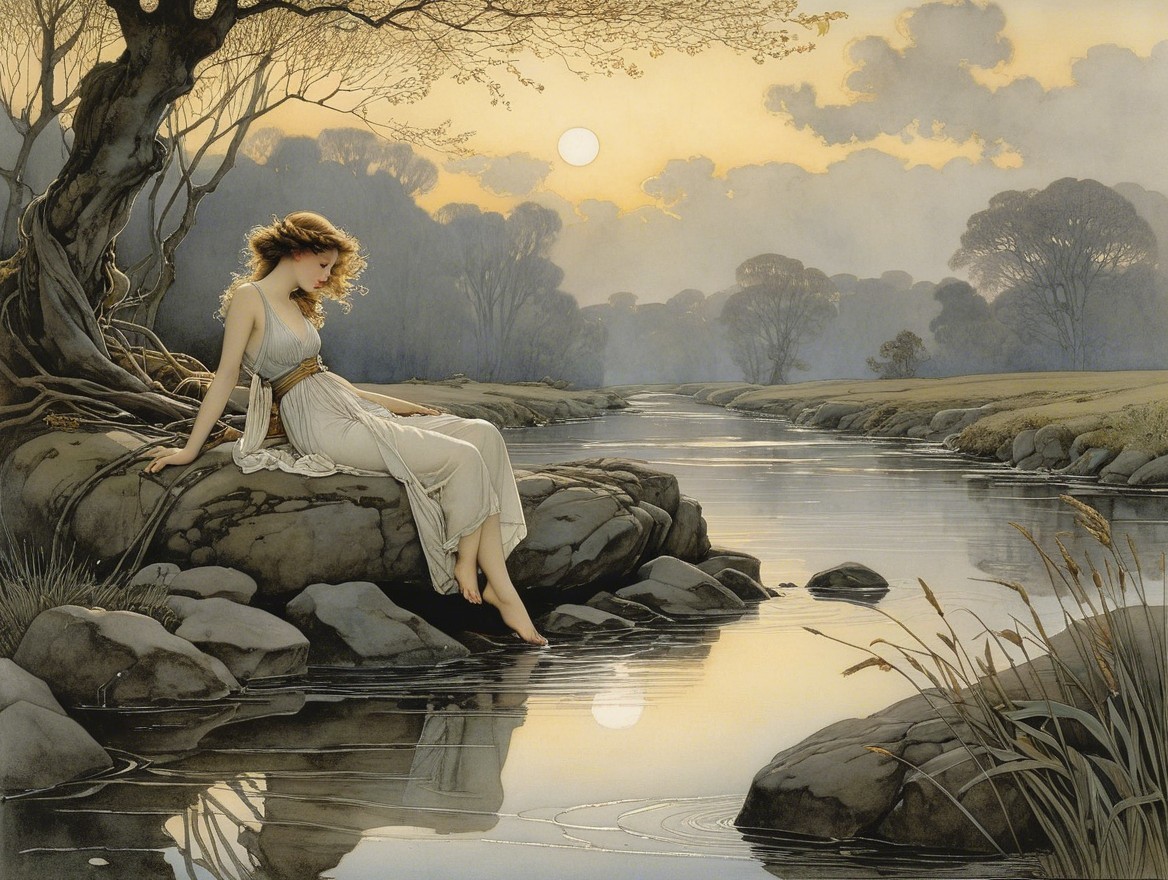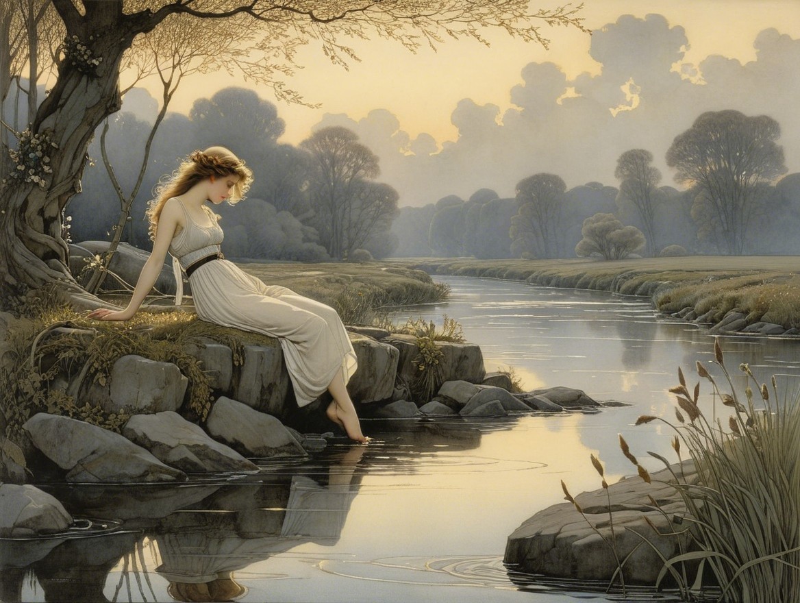 A serene scene features a young woman in a flowing white dress, sitting on a rock by a tranquil river. Soft sunlight filters through trees, casting a dreamy glow over the peaceful landscape.