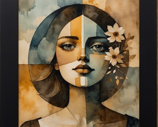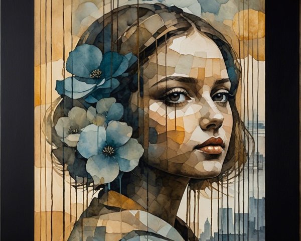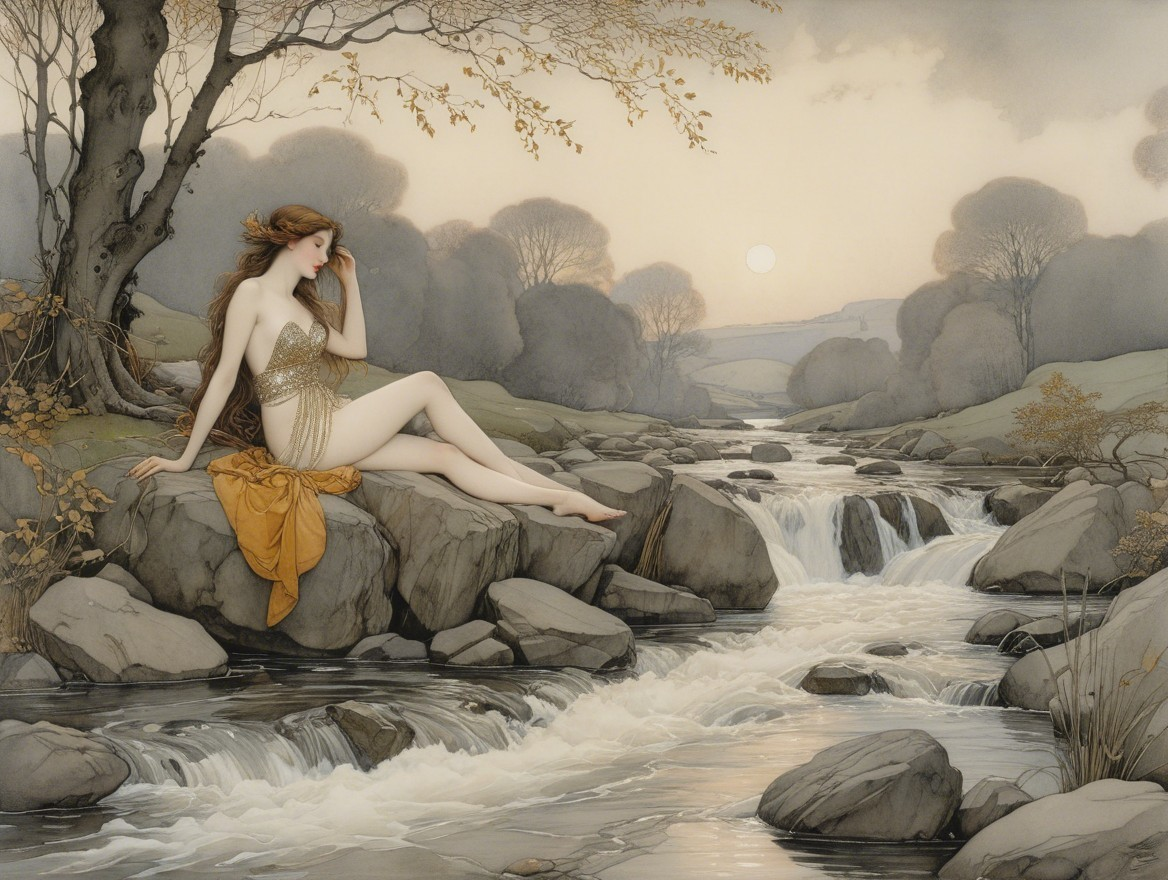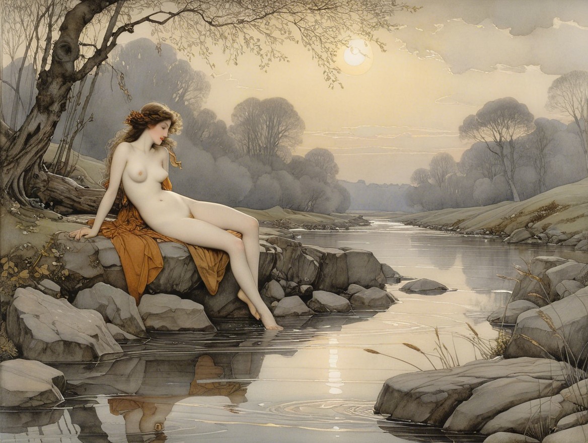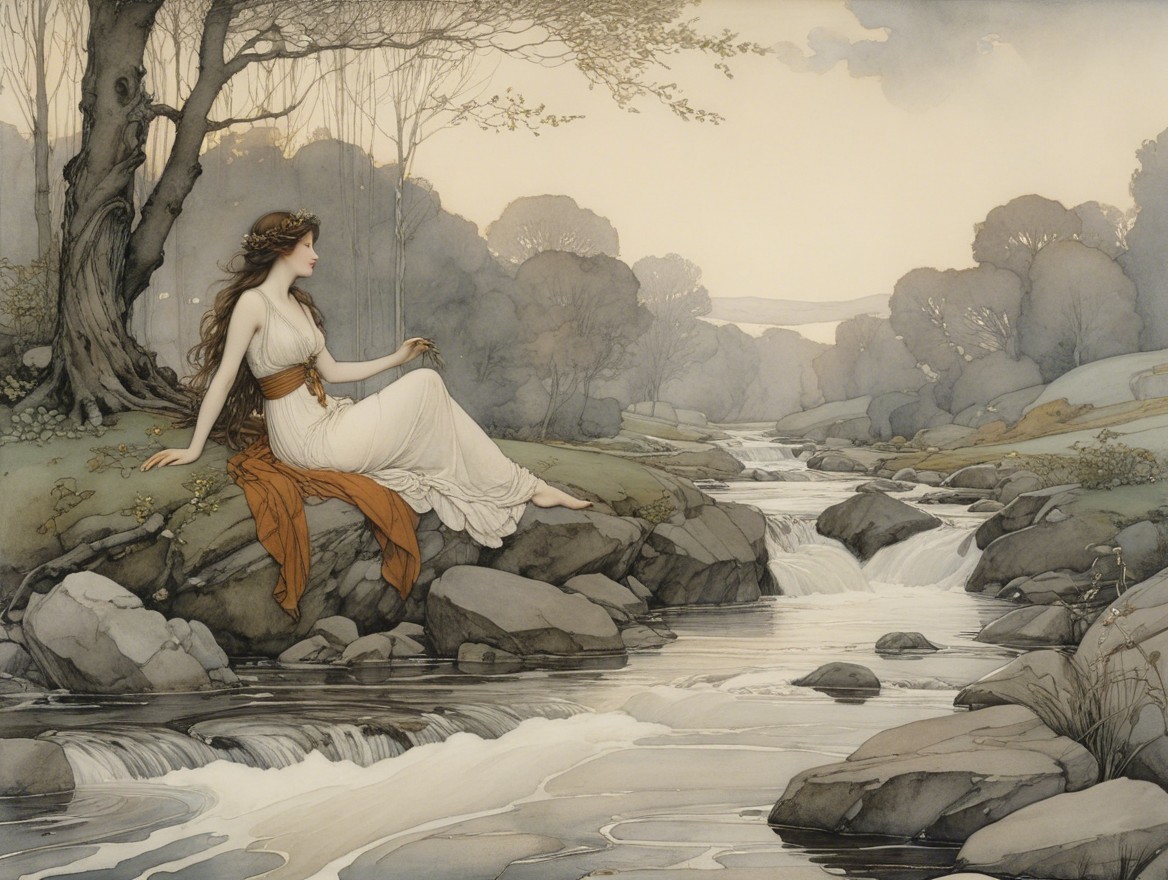 A serene scene features a young woman in a flowing white dress, sitting on a rock by a tranquil river. Soft sunlight filters through trees, casting a dreamy glow over the peaceful landscape.
