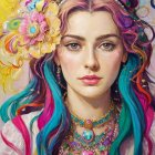 A beautiful woman adorned with intricate jewelry and a vibrant headdress featuring colorful gems and golden accents, complemented by flowing ribbons. Her serene expression captivates the viewer.